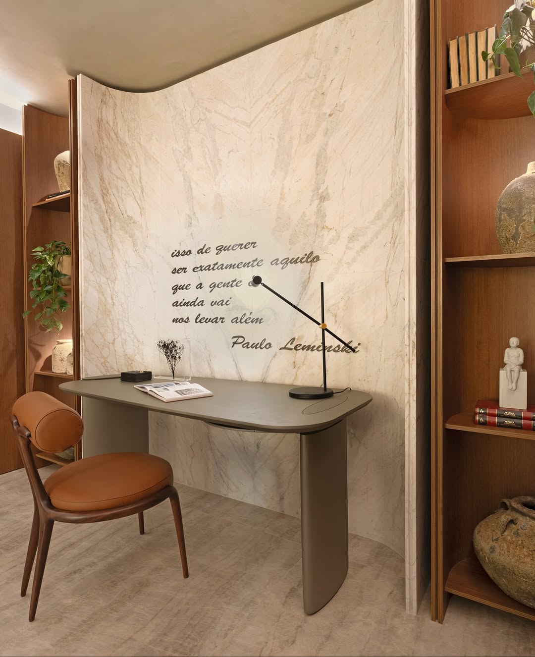 O desenho orgânico conduz o espaço com fluidez, enquanto o mobiliário, de traços leves e acabamentos artesanais, amplia a experiência sensorial. Mais do que compor, os elementos acolhem.
